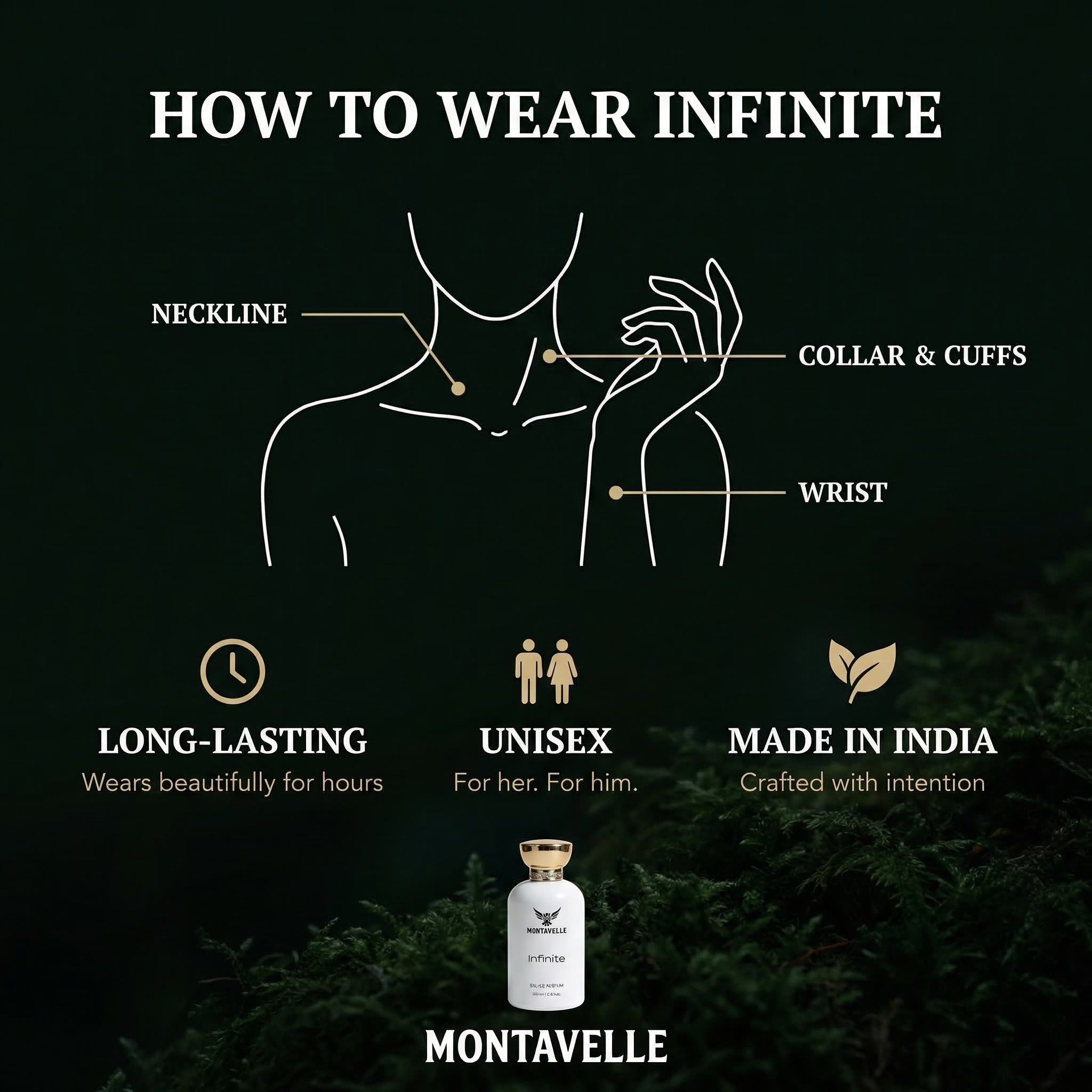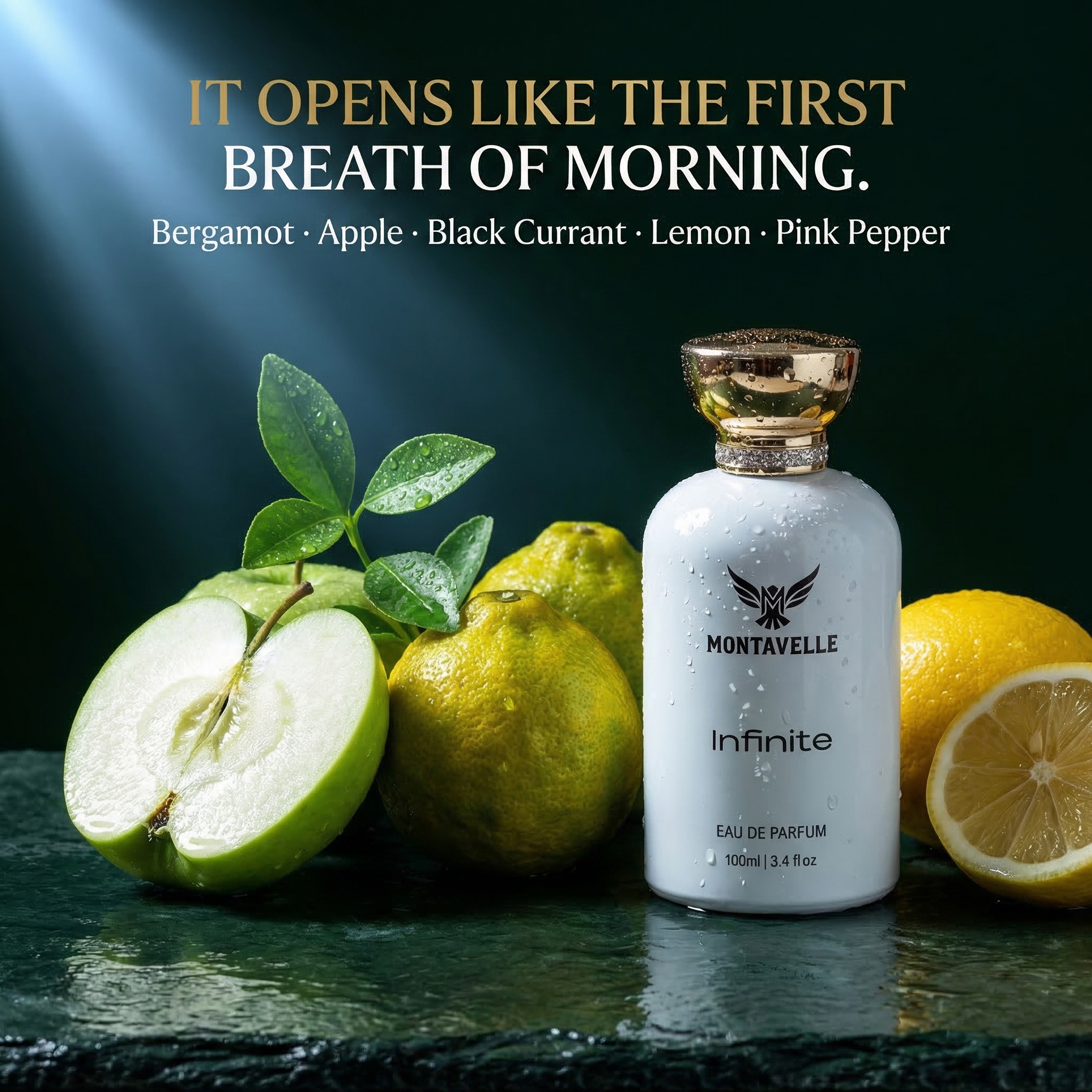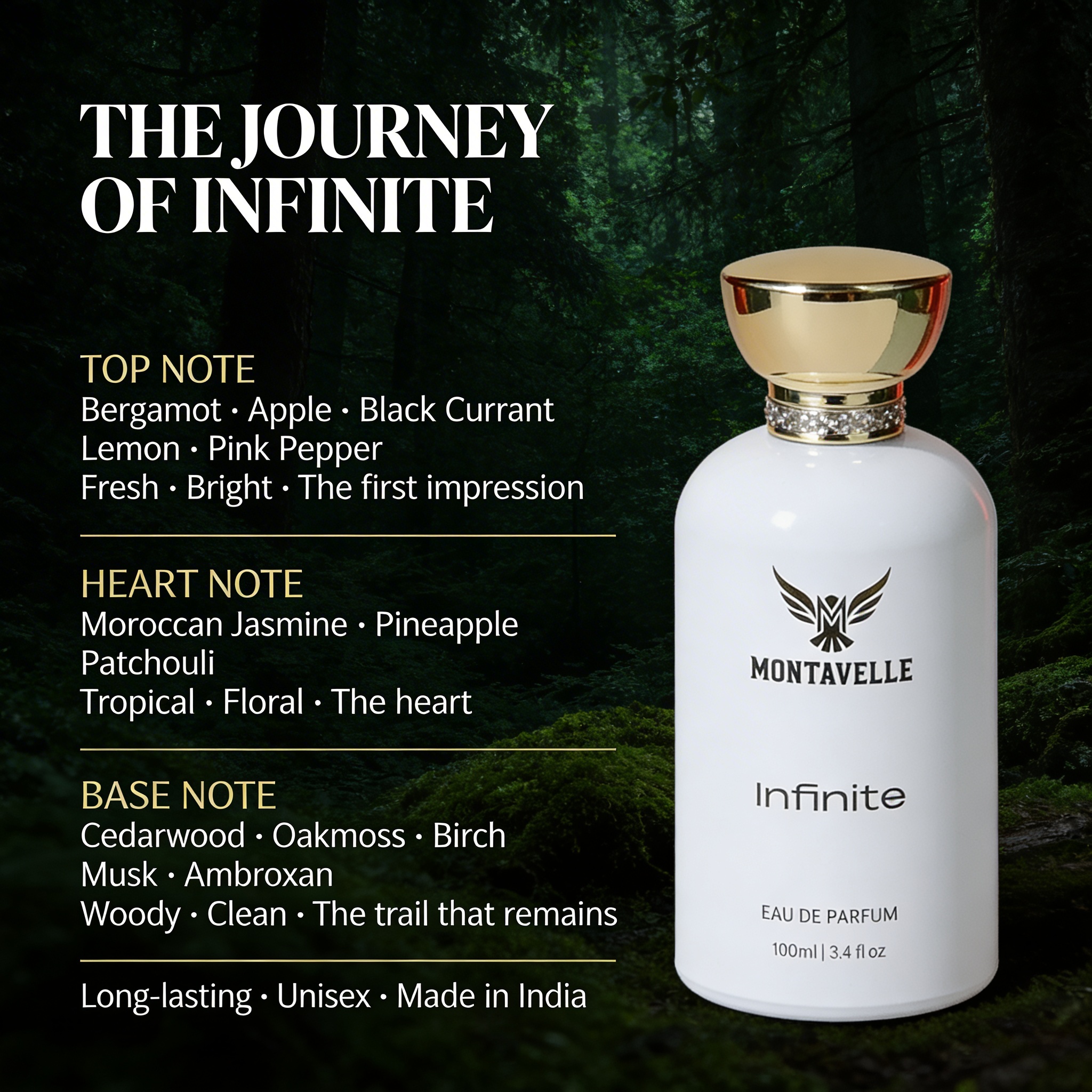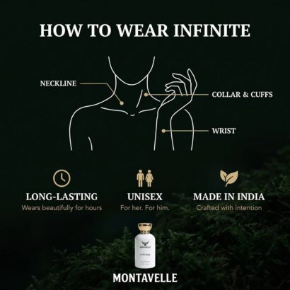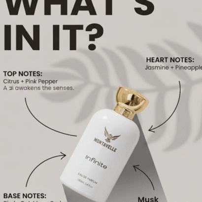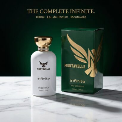 Montavelle Infinite is a bold, refreshing fragrance crafted for those who never stand still. It opens with vibrant notes of bergamot, lemon, apple, and black currant, delivering a crisp and energetic first impression. At its heart, pineapple, patchouli, and Moroccan jasmine create a smooth balance of freshness and depth. The fragrance settles into a powerful base of birch, oak moss, cedarwood, musk, and ambroxan, leaving behind a warm, masculine trail that lasts all day.