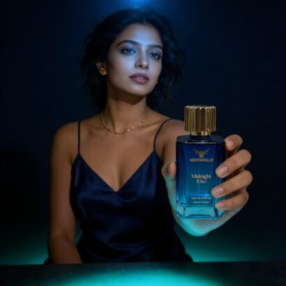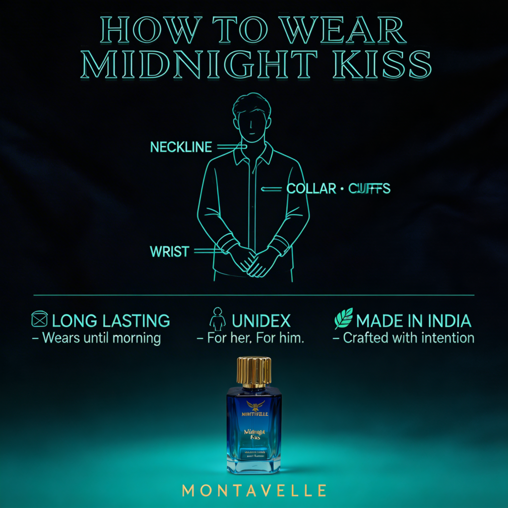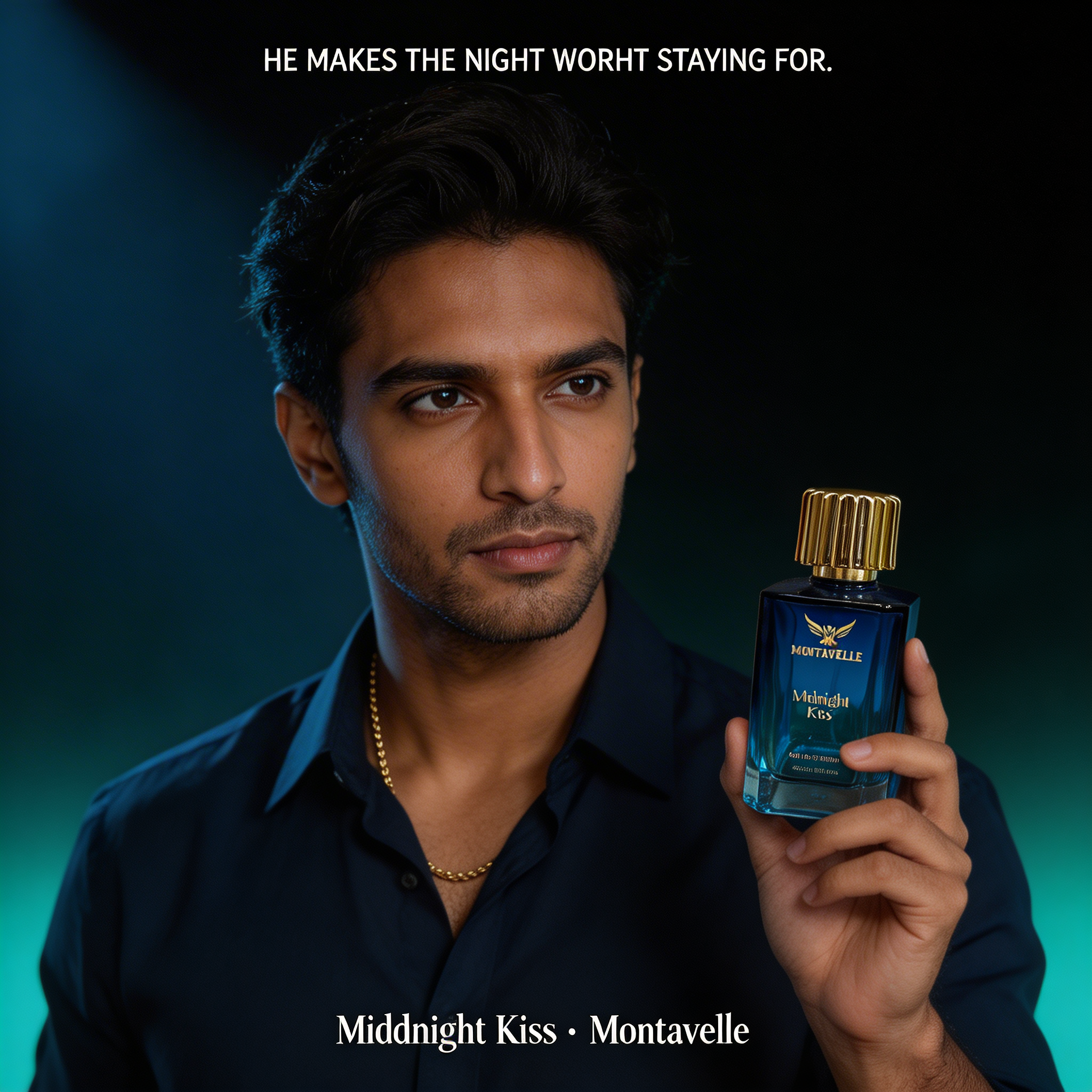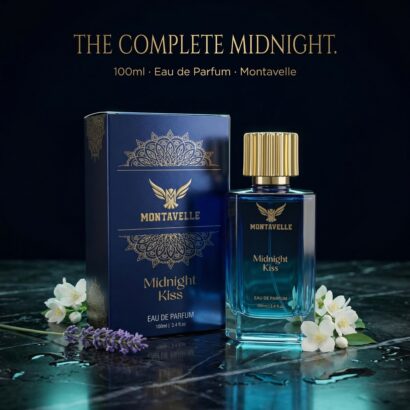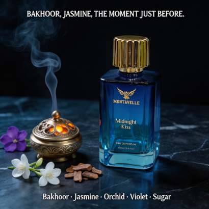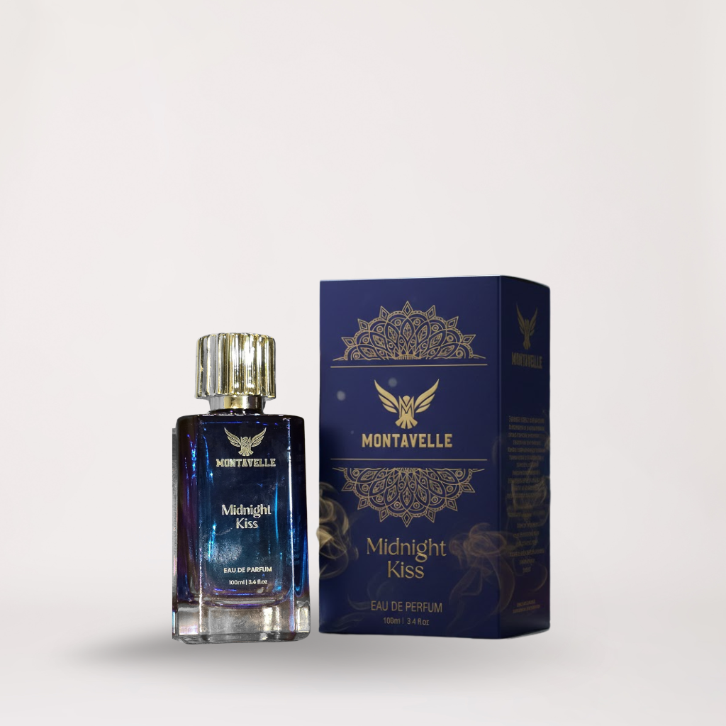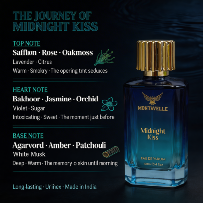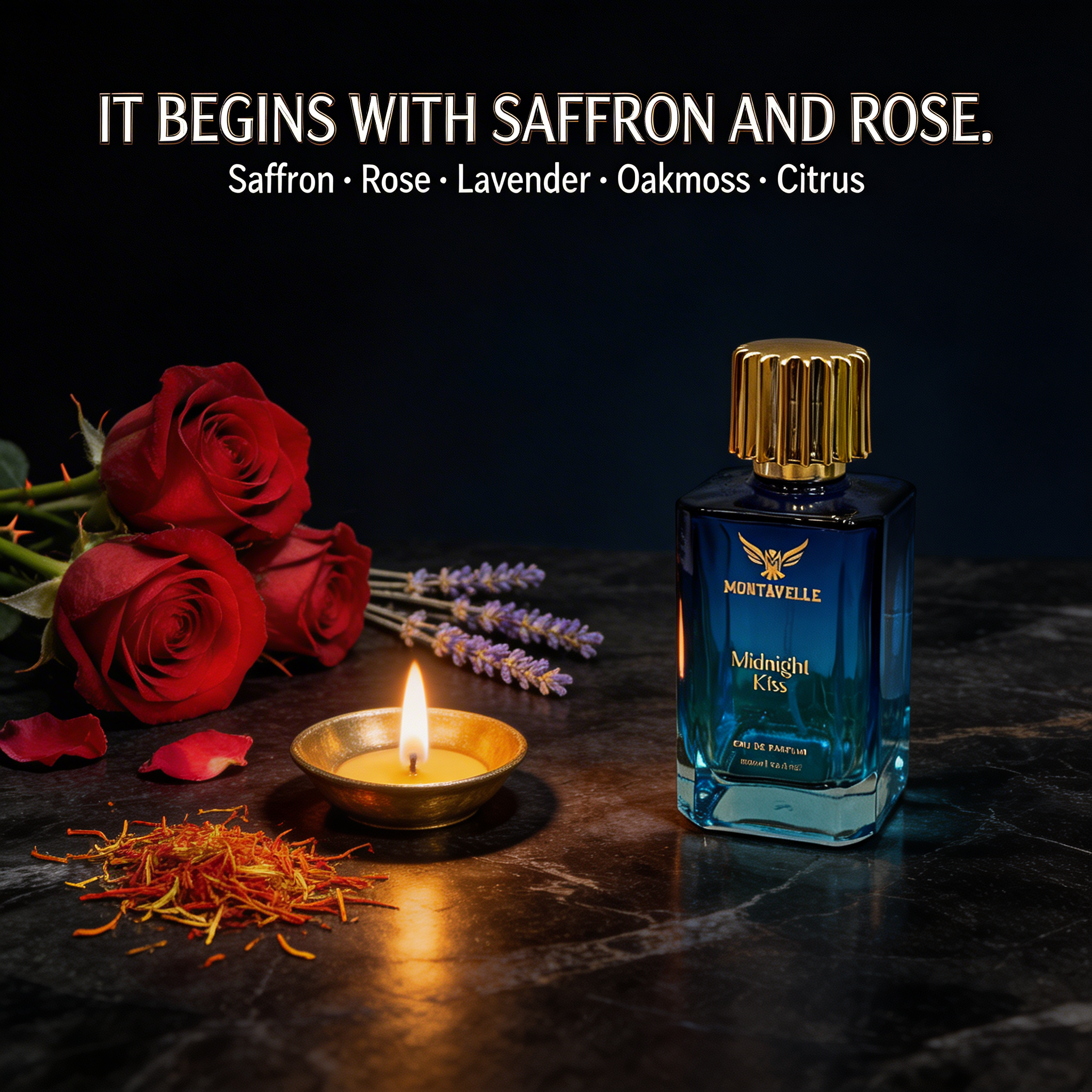 MIDNIGHT KISS is an intoxicating blend where spiced saffron and soft rose meet a heart of sweet sugar accord, smoky bakhoor, and delicate florals. As the night deepens, precious oud, warm amber, and white musk melt into the skin, leaving behind a sensual, long-lasting trail made for unforgettable moments after dark.